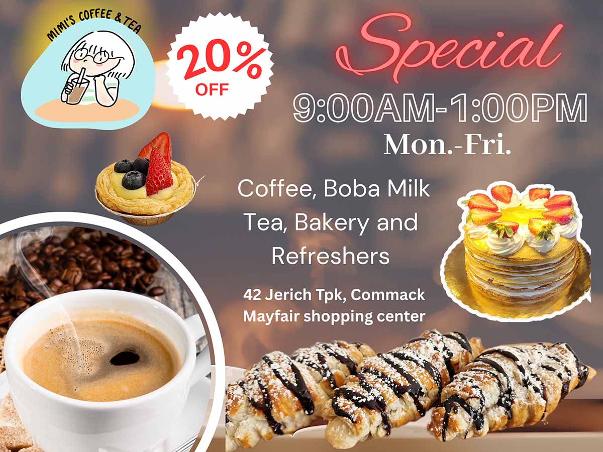 Mimi’s Coffee, Tea, Bubble Tea & Bakery is Located in the Mayfair Shopping Center in Commack, New York. Long Island’s Newest & Exciting Coffee, Tea, Bubble Tea & Bakery Serving Commack & Suffolk County, Long Island. The Bakery Serves Bubble Tea, Brewed Teas, Coffee, Other Drinks & Offers Warm Bakery Items.
